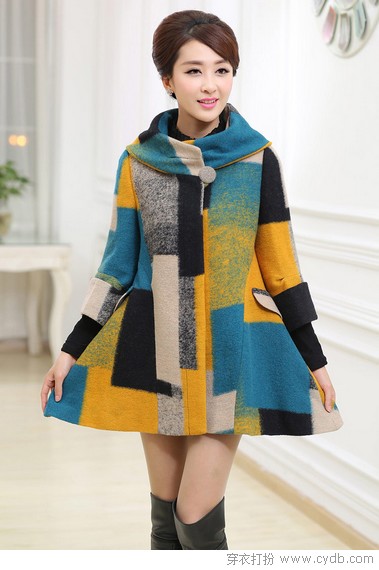 格纹拼色中长款毛呢大衣